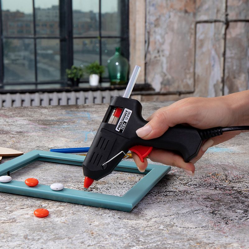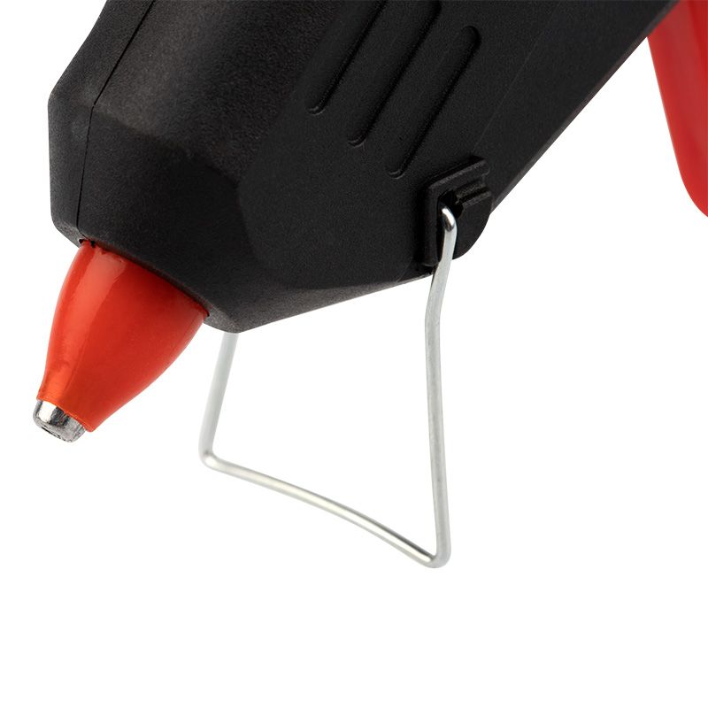 Клеевой пистолет предназначен склеивания поверхностей различных материалов, герметизации стыков и швов, фиксации проводов с помощью расплавленной клеевой массы. Корпус пистолета изготовлен из ударопрочной пластмассы, а специальная скоба позволяет устанавливать пистолет в режиме ожидания. Эргономичная рукоятка обеспечивает комфортный и надежный захват инструмента. Сопло пистолета защищено клапаном от произвольного вытекания клея и оснащено термостойким силиконовым протектором. Автоматическое регулирование температуры внутри плавильной камеры позволяет поддерживать оптимальную для клеевых стрежней температуру. На корпусе пистолета есть кнопка включения, благодаря которой пользователю удобнее контролировать использование пистолета. Провод длиной 1,4 метра позволяет работать на удобном расстоянии от розетки. Пистолет используется с клеевыми стрежнями диаметром 7 мм.